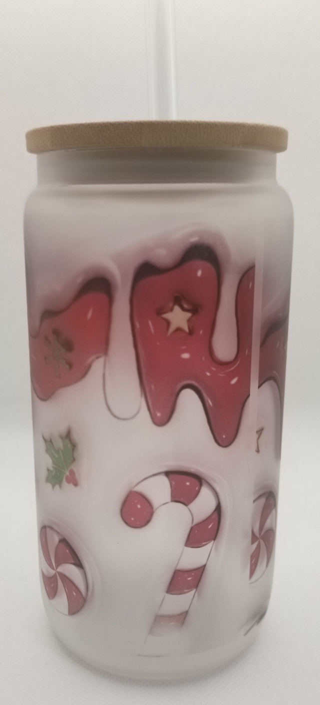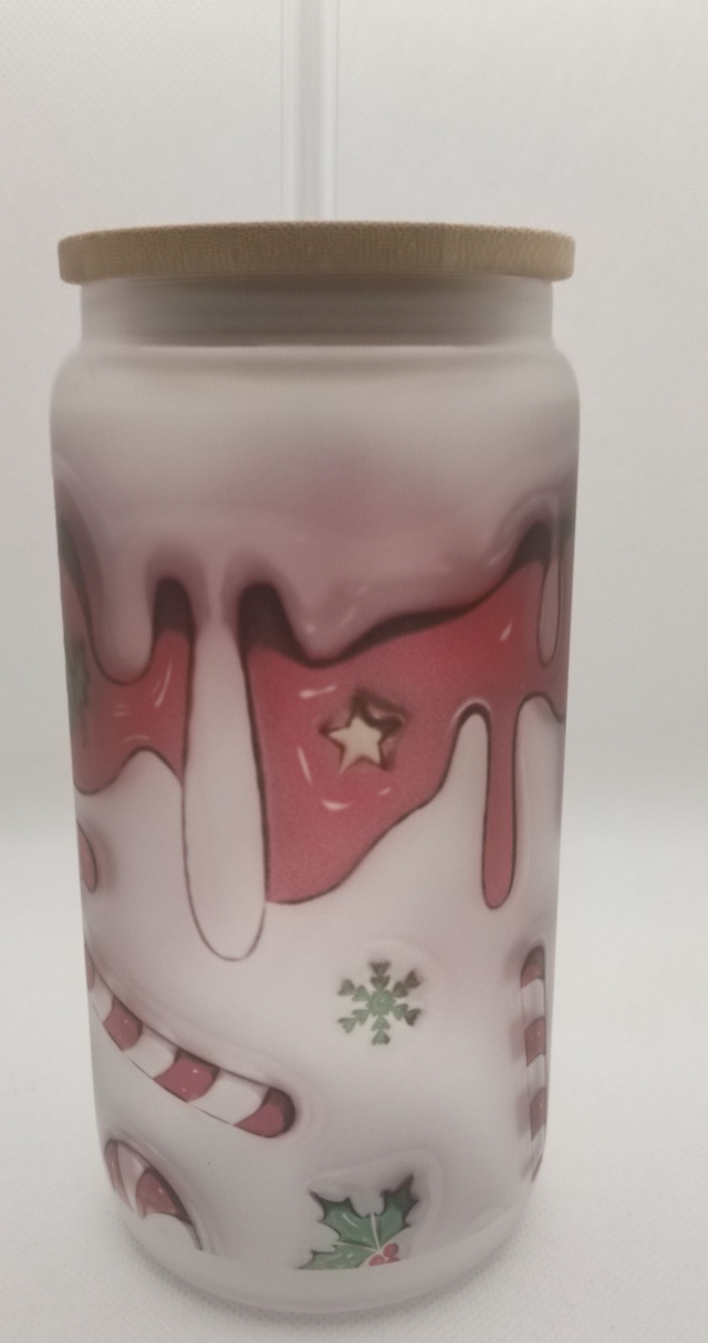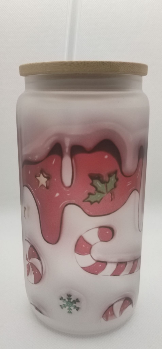 Gobelet en verre givré sublimé à chaud avec couvercle bambou et paille en verre.